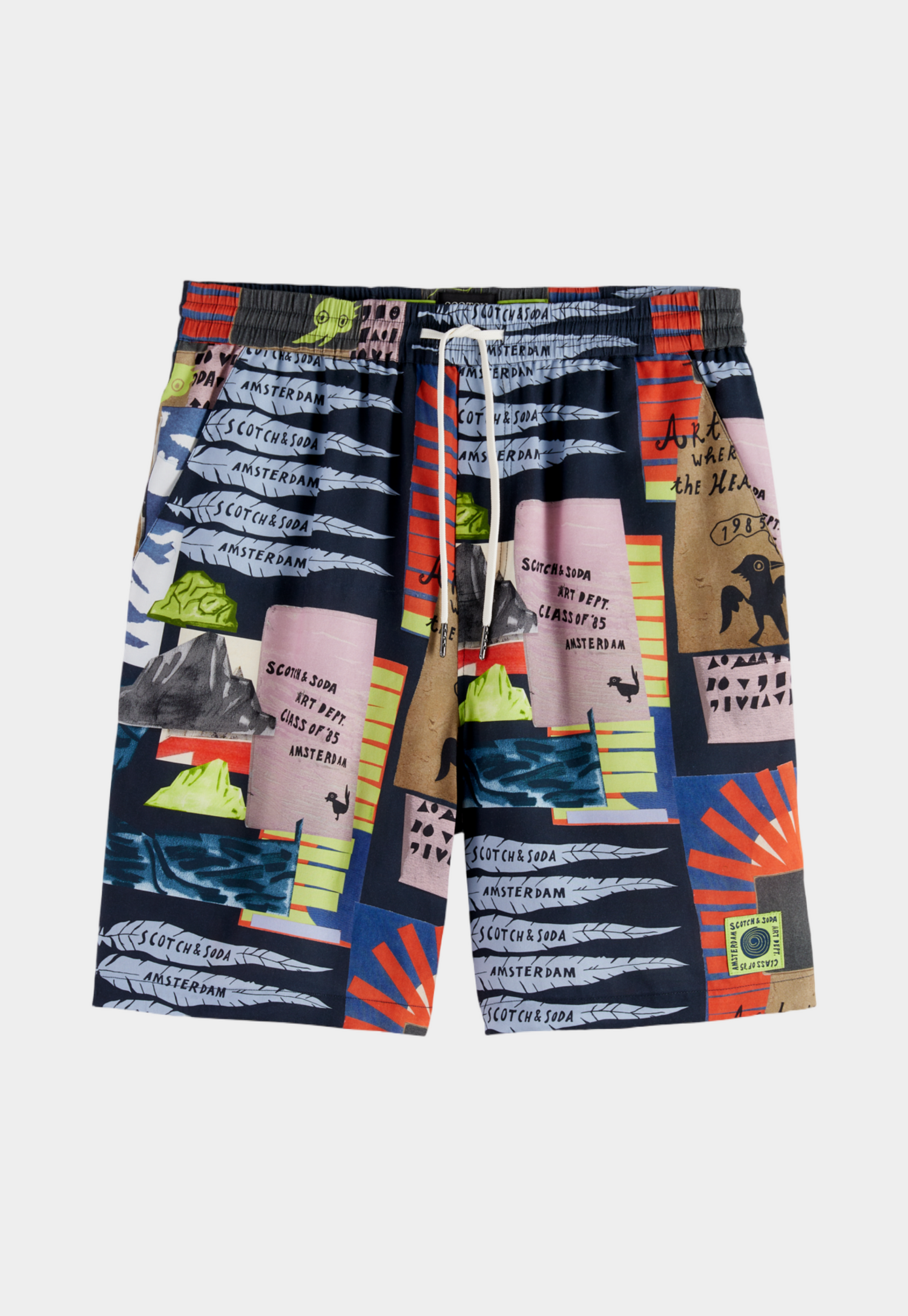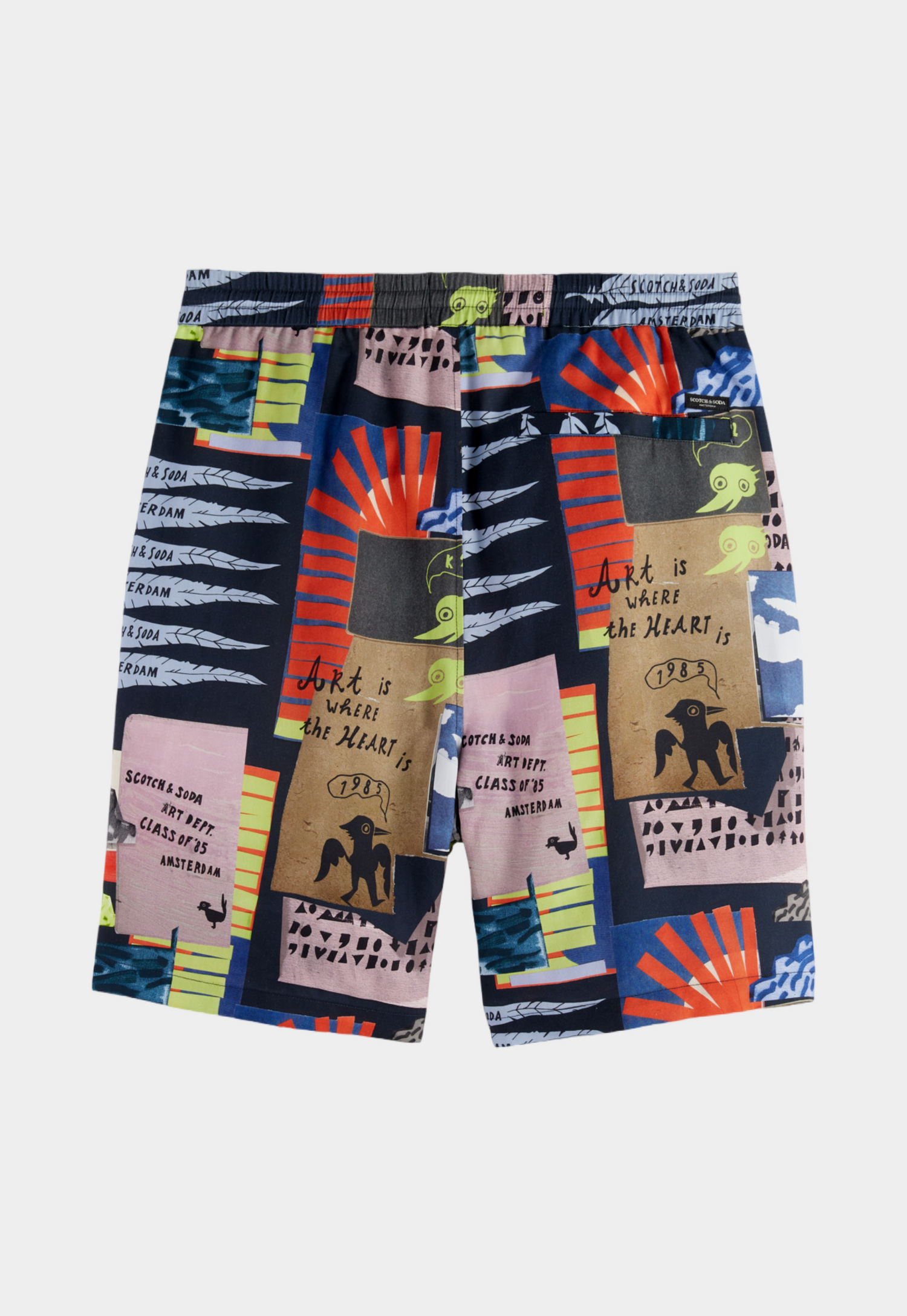 מכנסיים קצרים לגברים מבית המותג סקוצ' אנד סודה. בגזרת ברמודה, עם גומי במותן, שרוכי קשירה ושני כיסים קדמיים. עם הדפס צבעוני אול אובר.