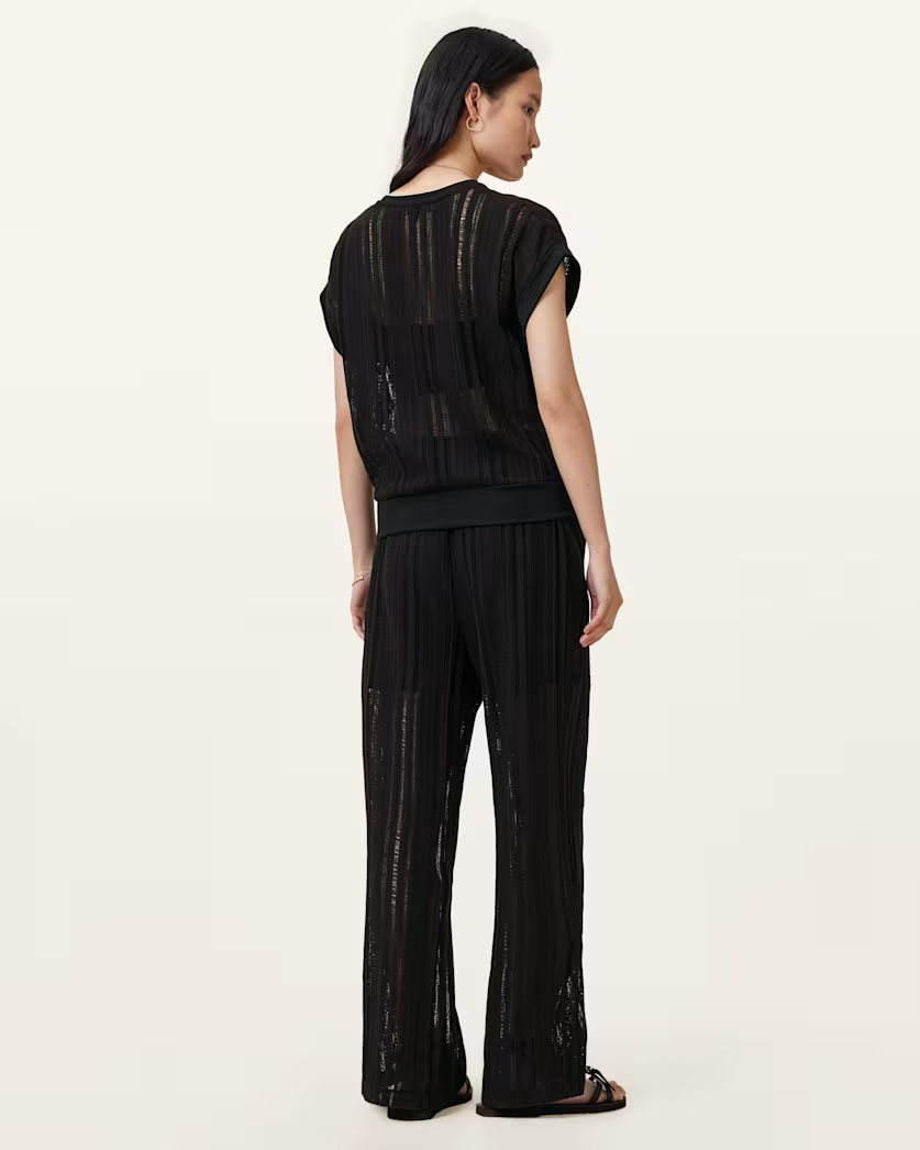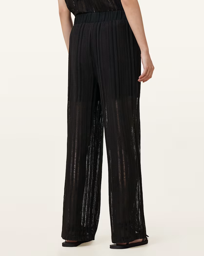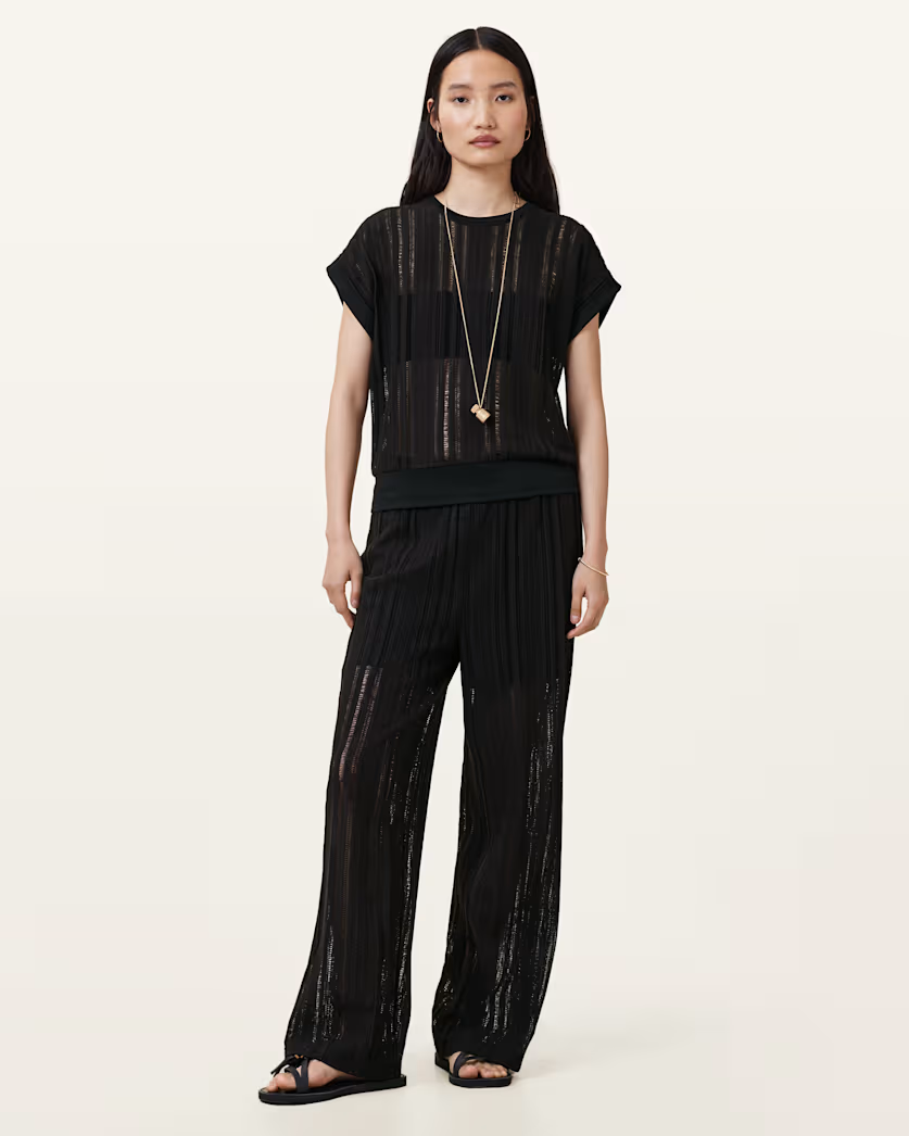 מכנסיים ארוכים לנשים מבית המותג אולסיינטס. בגזרה משוחררת, עם גומי במותן, ומרקם פסים שקפקפים.