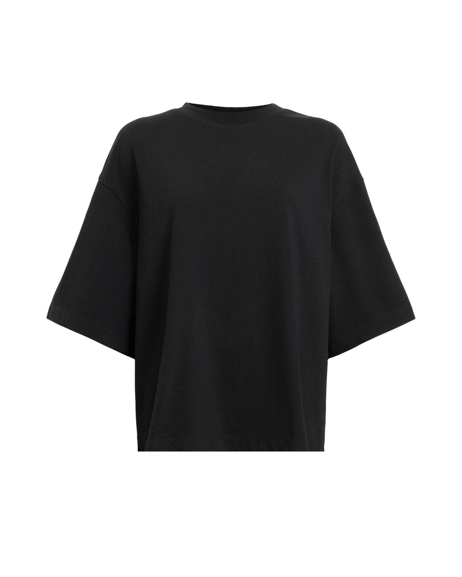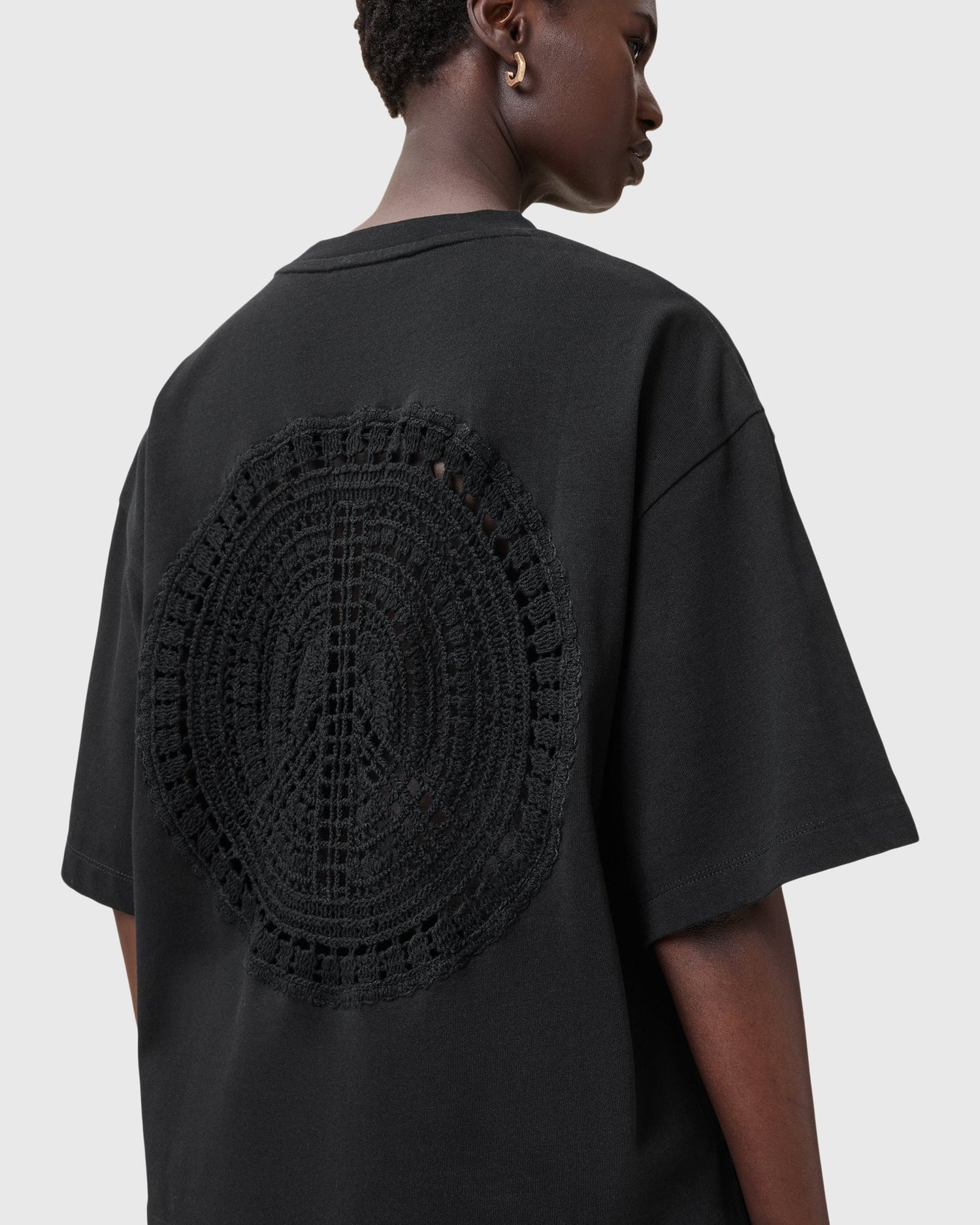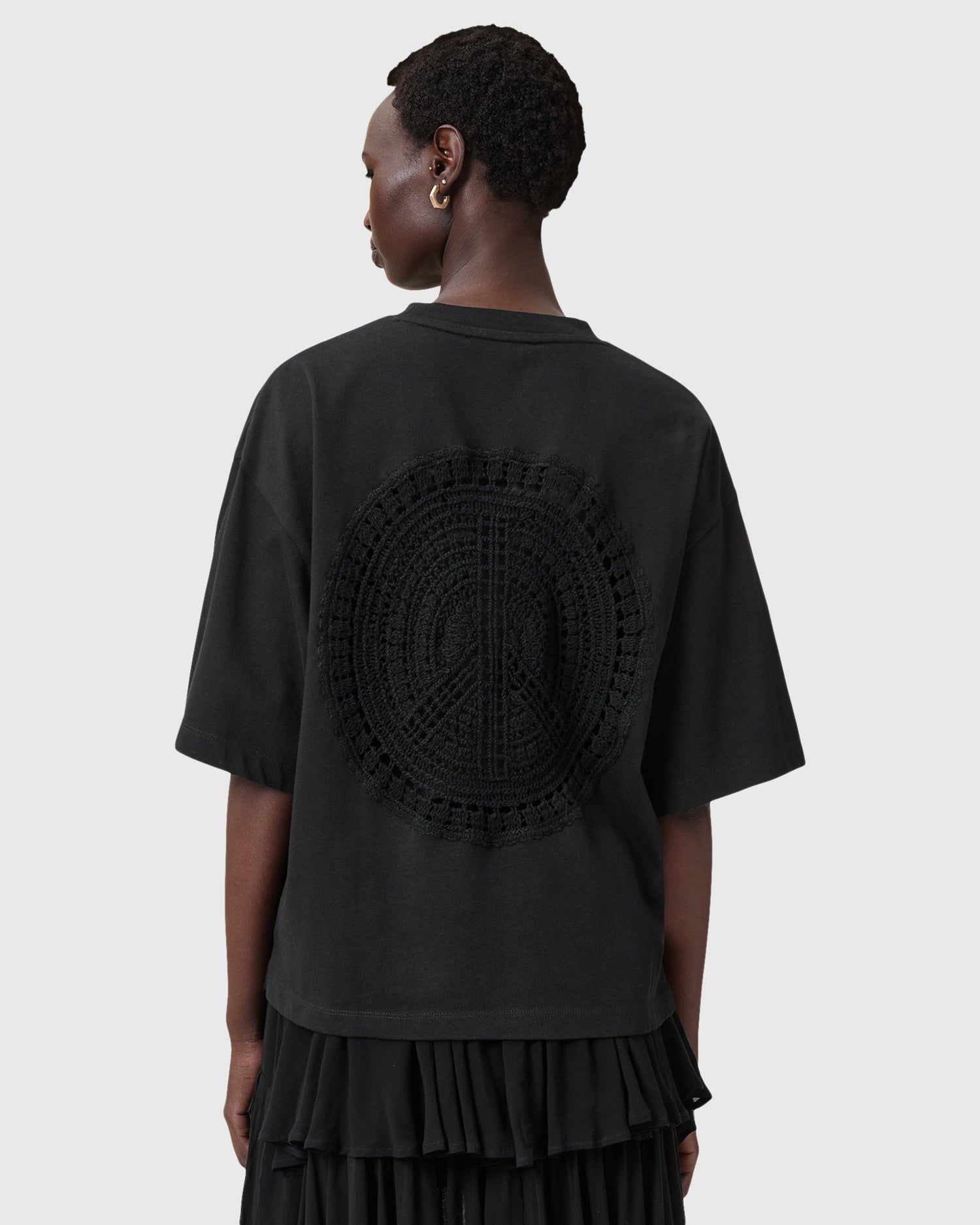 טי שירט קצרה לנשים מבית המותג אולסיינטס. בגזרת אוברסייז עם מפתח עגול גבוה, שרוולים קצרים באורך המרפק, בשילוב אלמנט פיס מקרושה גדול בגב החולצה.