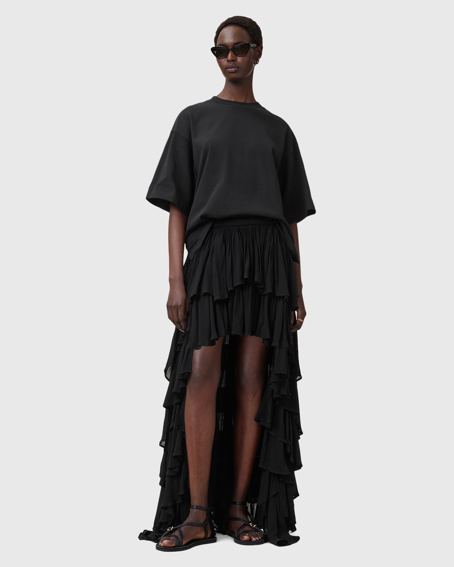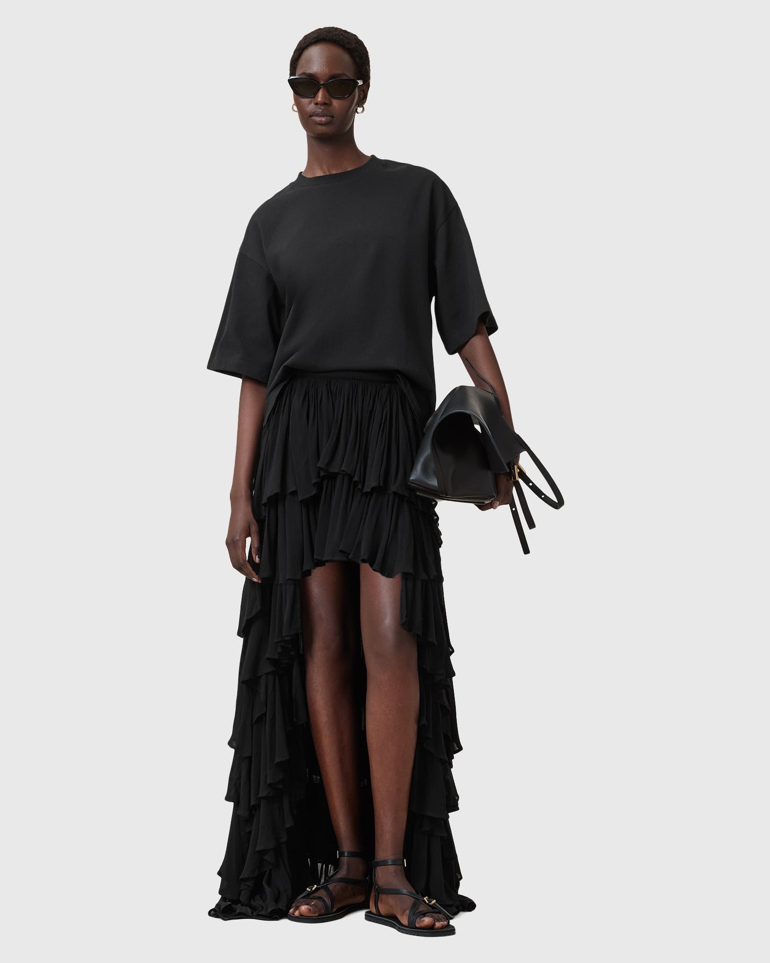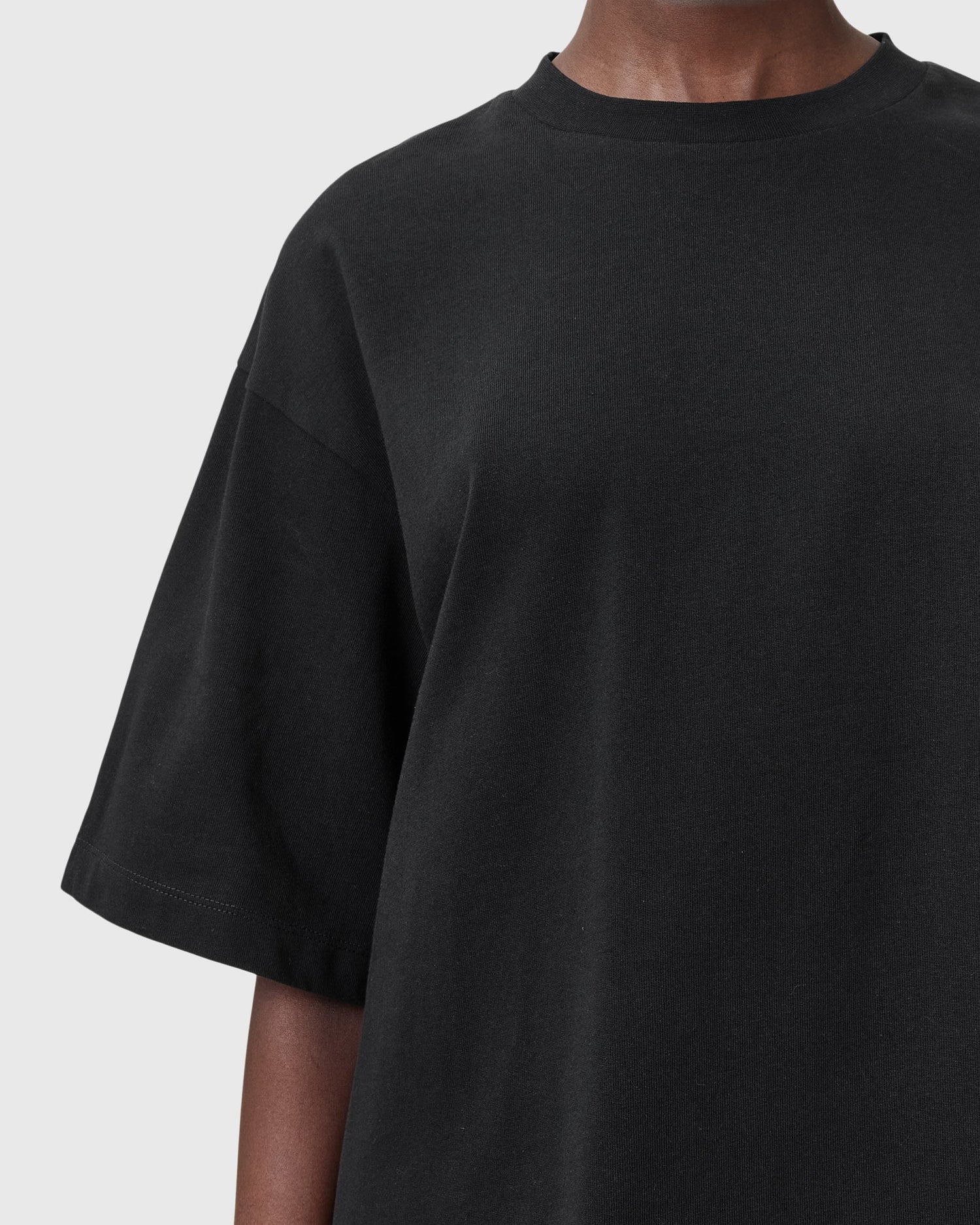 טי שירט קצרה לנשים מבית המותג אולסיינטס. בגזרת אוברסייז עם מפתח עגול גבוה, שרוולים קצרים באורך המרפק, בשילוב אלמנט פיס מקרושה גדול בגב החולצה.