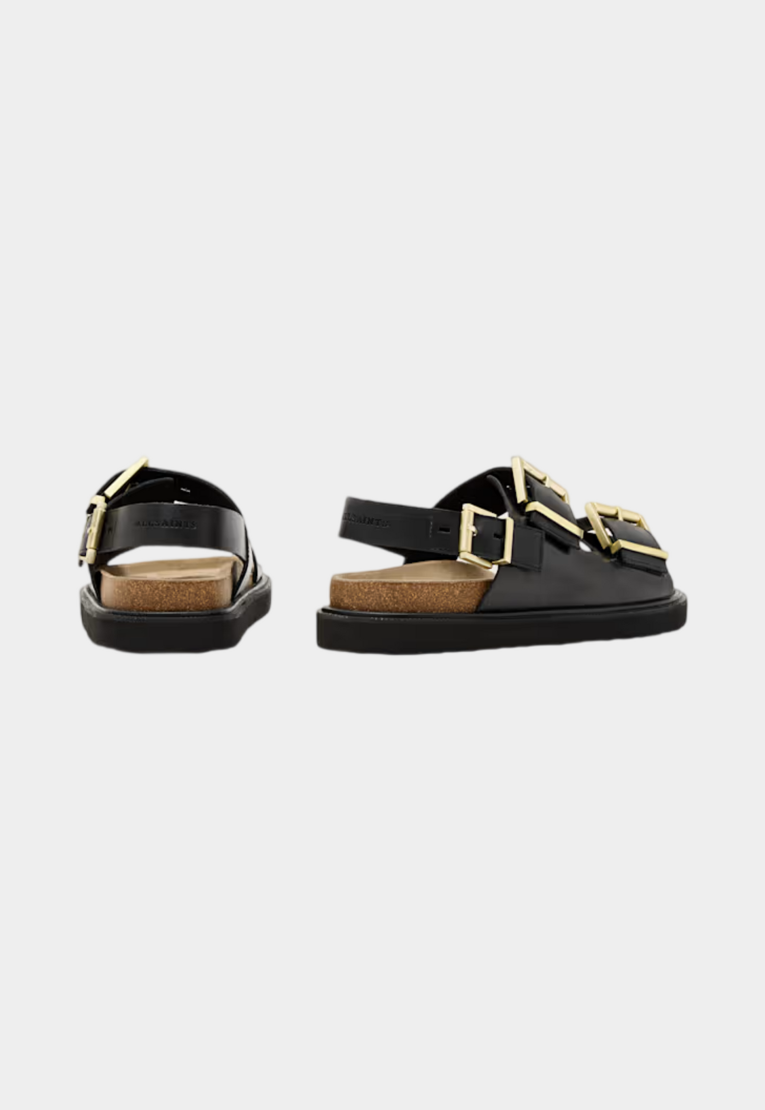 סנדלים לנשים מבית המותג אולסיינטס. עם שתי רצועות עבות בחזית, עם סגירת אבזמי זהב הניתנים להתכוננות. בשילוב רצועת קרסול עם אבזם זהב וסוליה שטוחה ועבה.