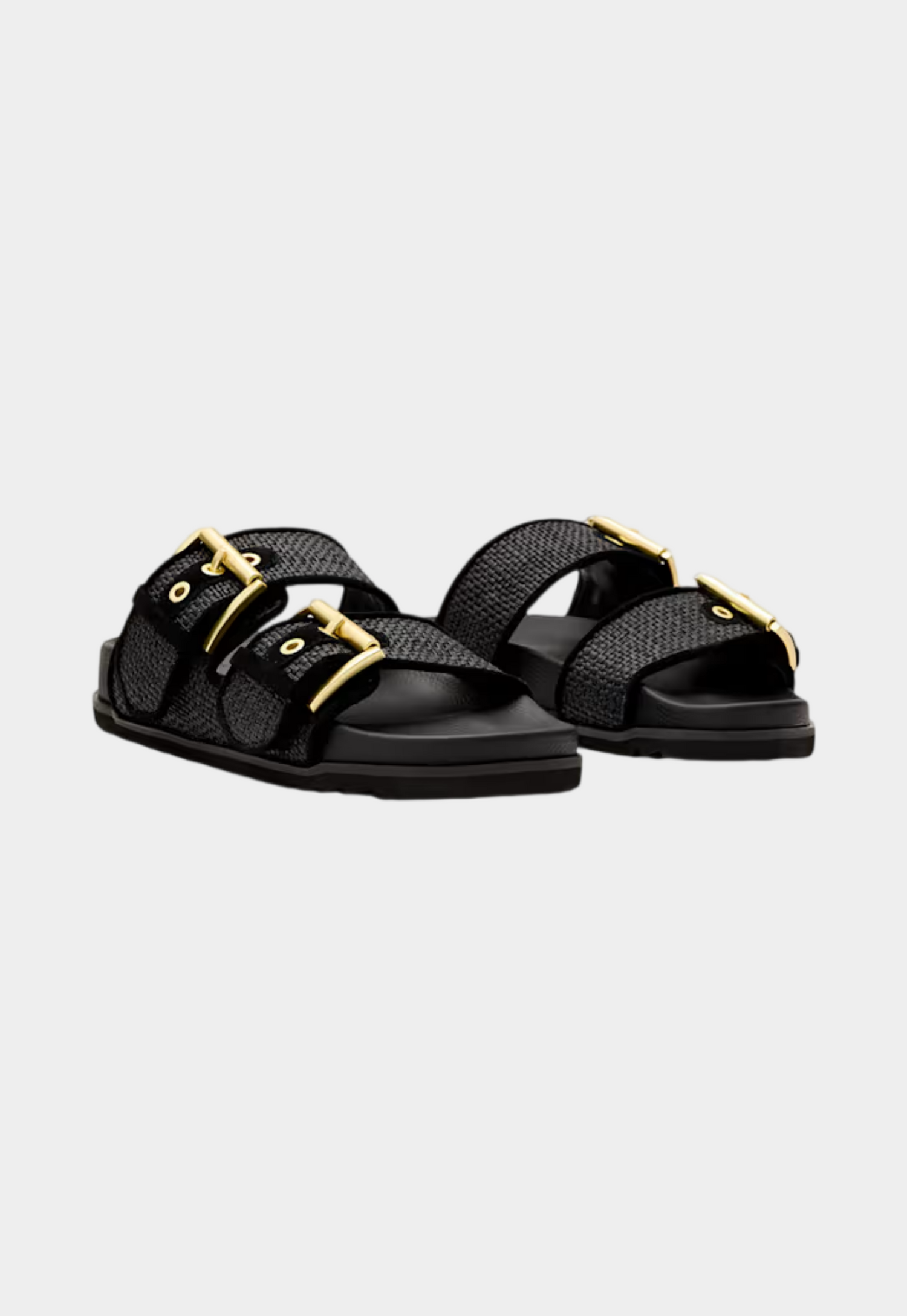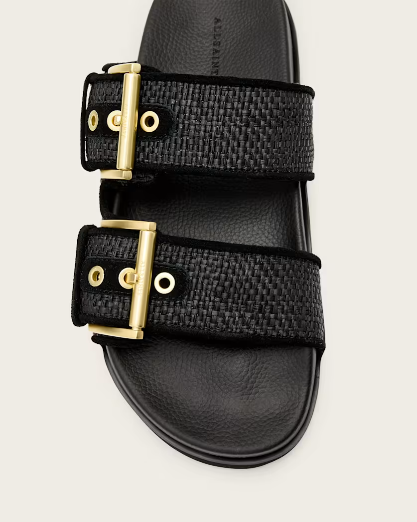 כפכפים לנשים מבית המותג אולסיינטס. עם שתי רצועות עבות בחזית, בשילוב אבזמי זהב מתכווננים. הכפכפים מעור בשילוב ראפיה.