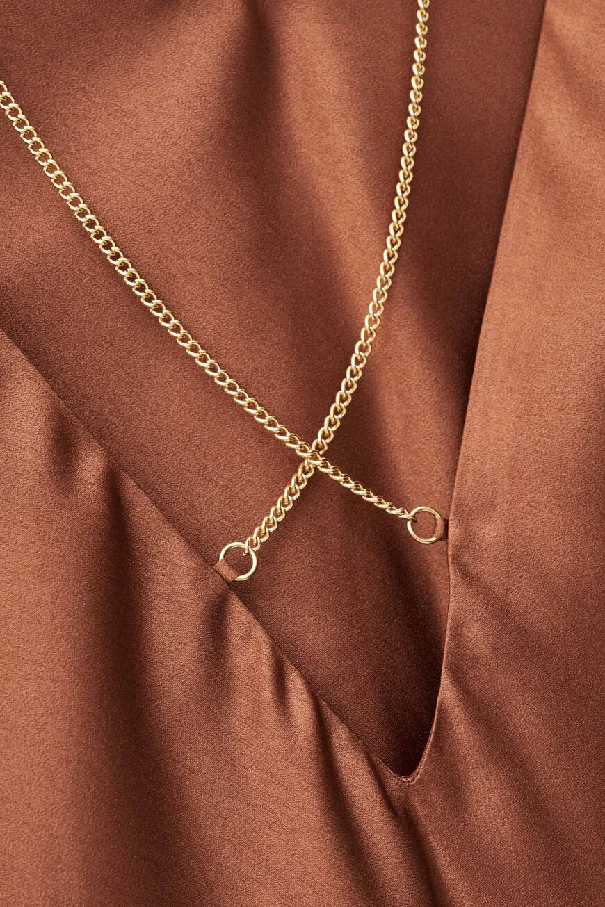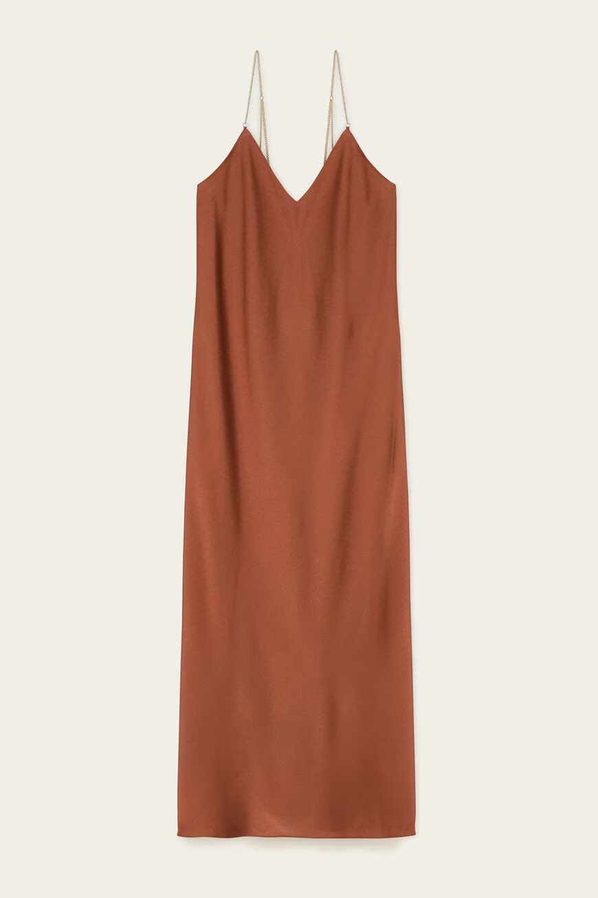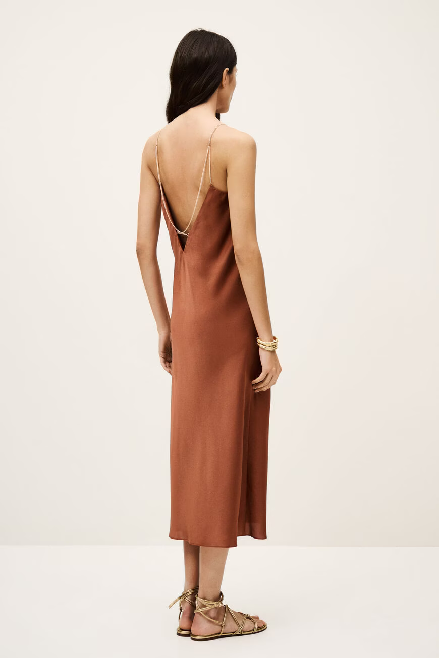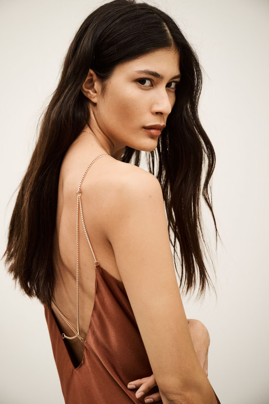 בגזרה נשפכת, עם מפתח וי וכתפיות שרשרת דקות. בעלת מחשוף עמוק בגב.
