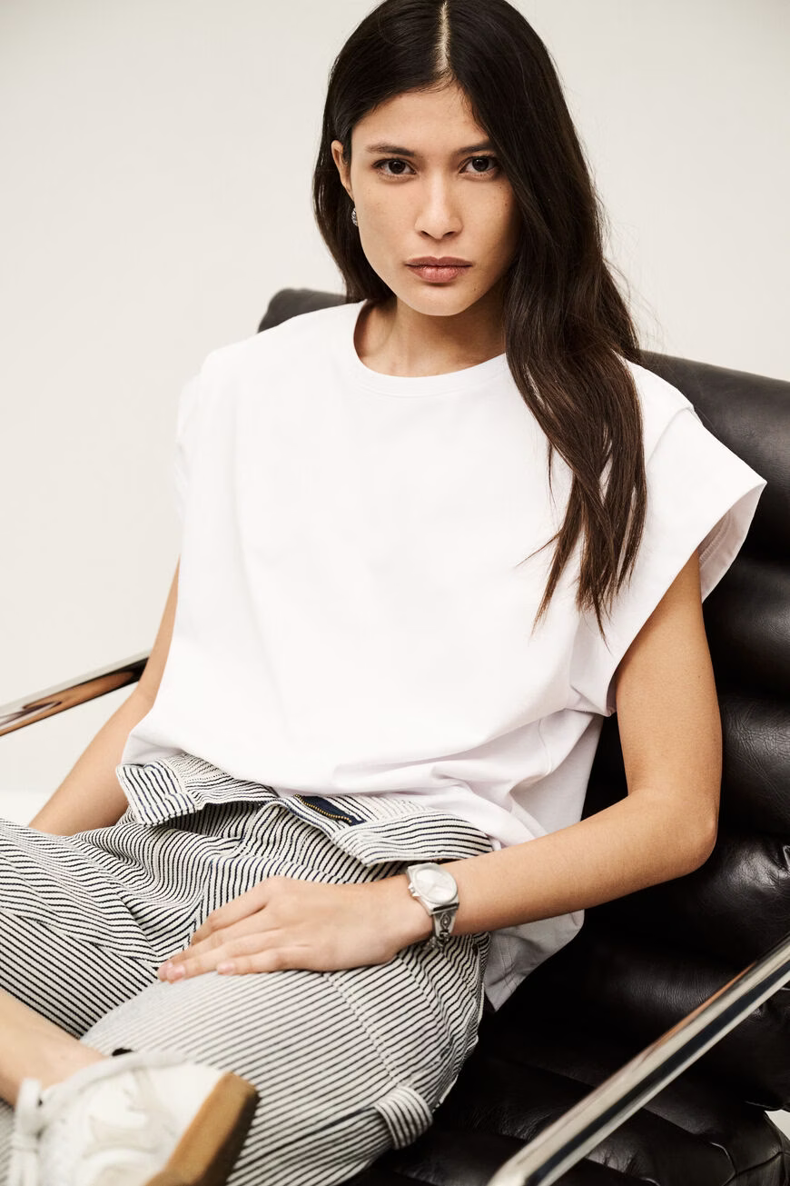 בגזרה ישרה ומשוחררת עם שרוולים רחבים וכתפיים מודגשות.