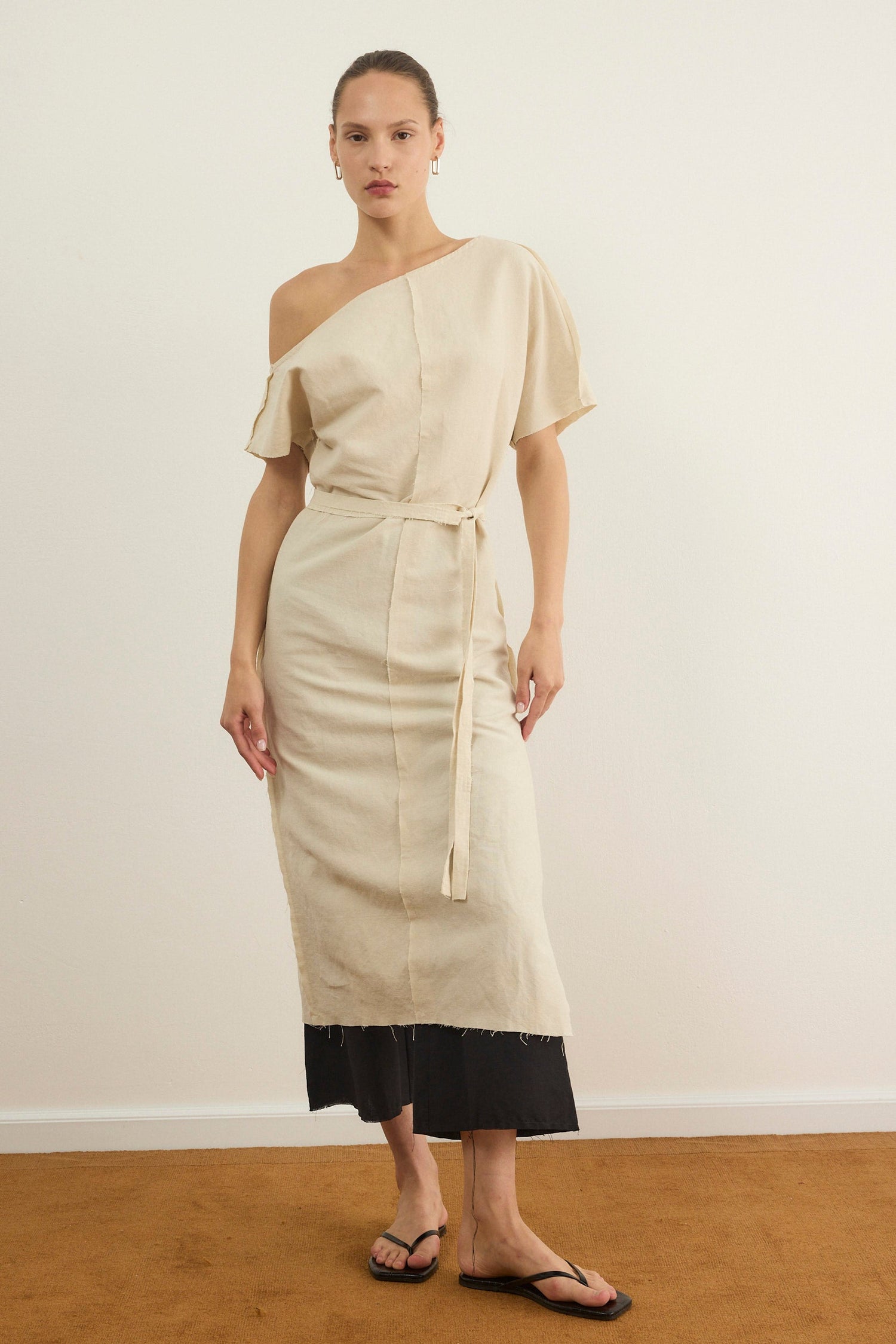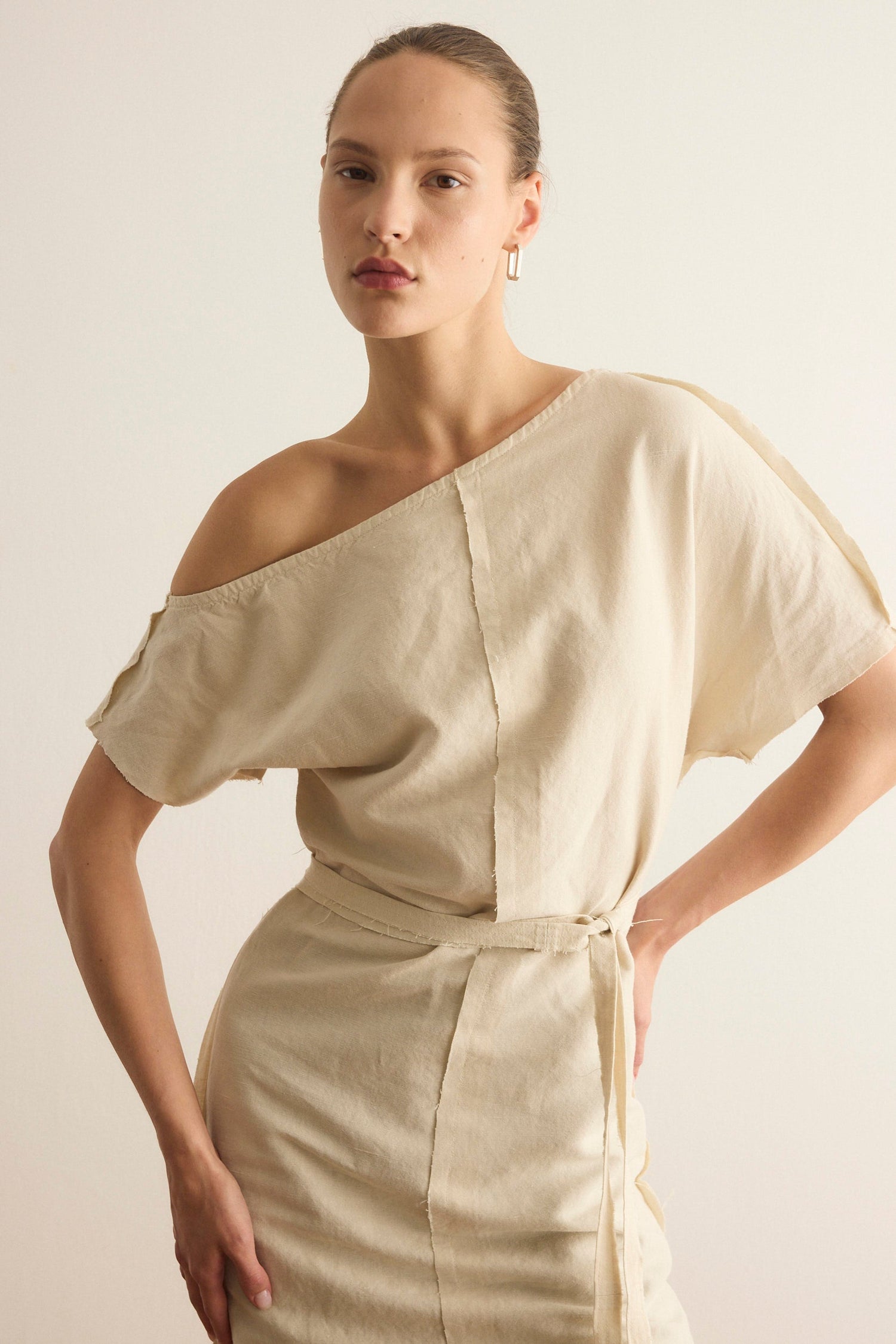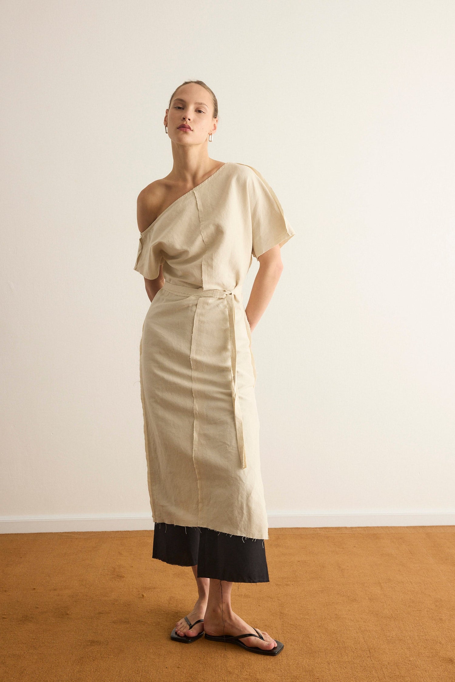 שמלת מידי אסימטרית בגזרה צמודה עם קשירה במותן ושסע בתפר צד ודיטיילס פרימות בסיומת, עשויה מבד פשתן נעים וקייצי.