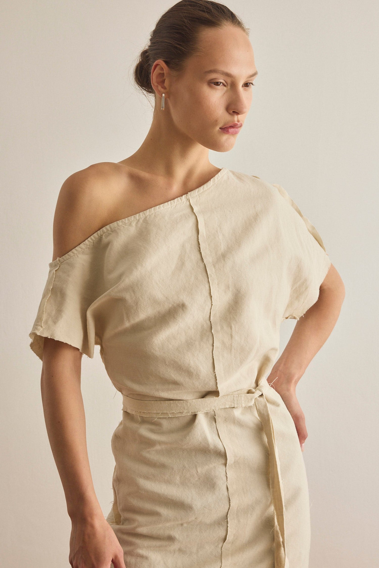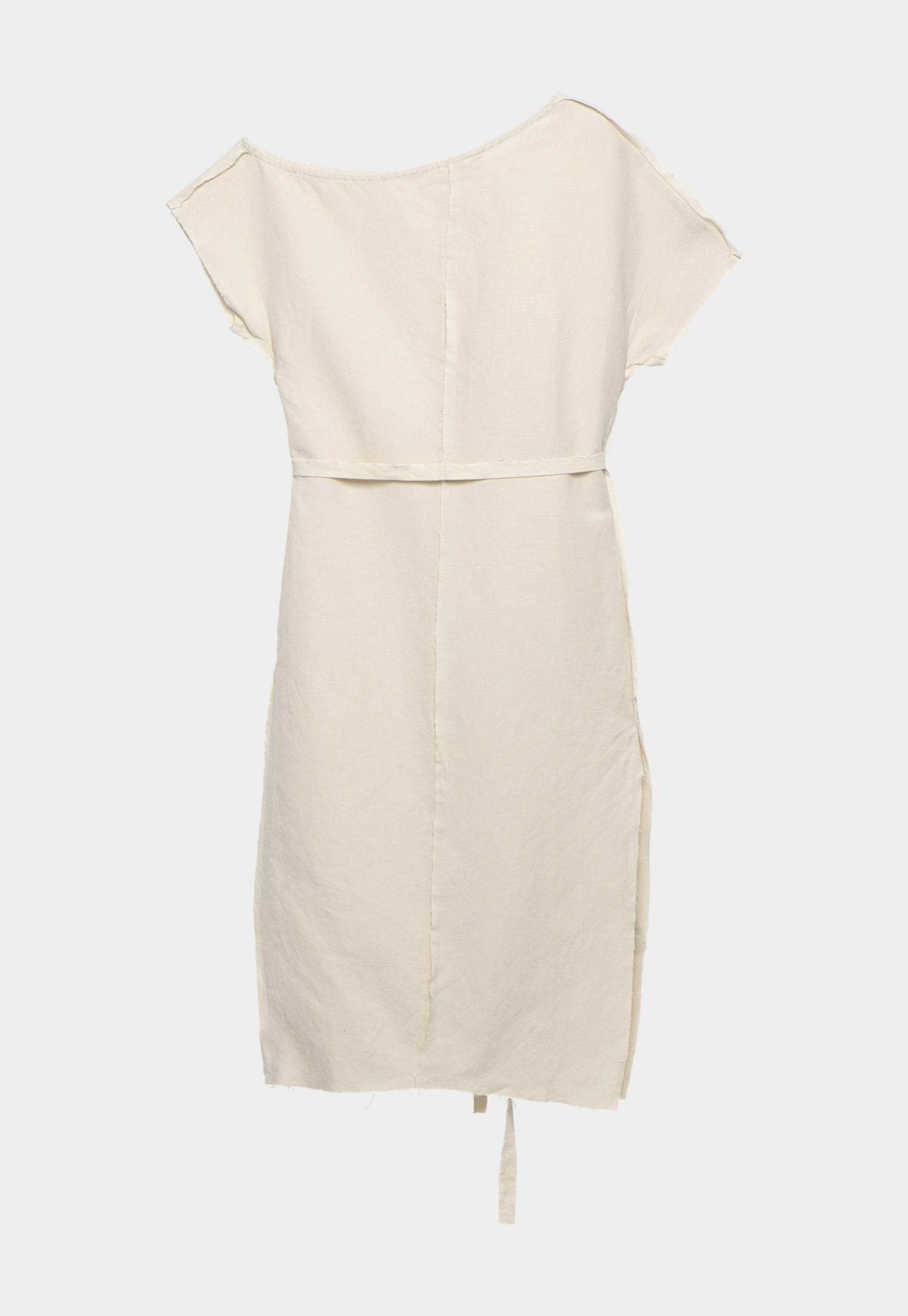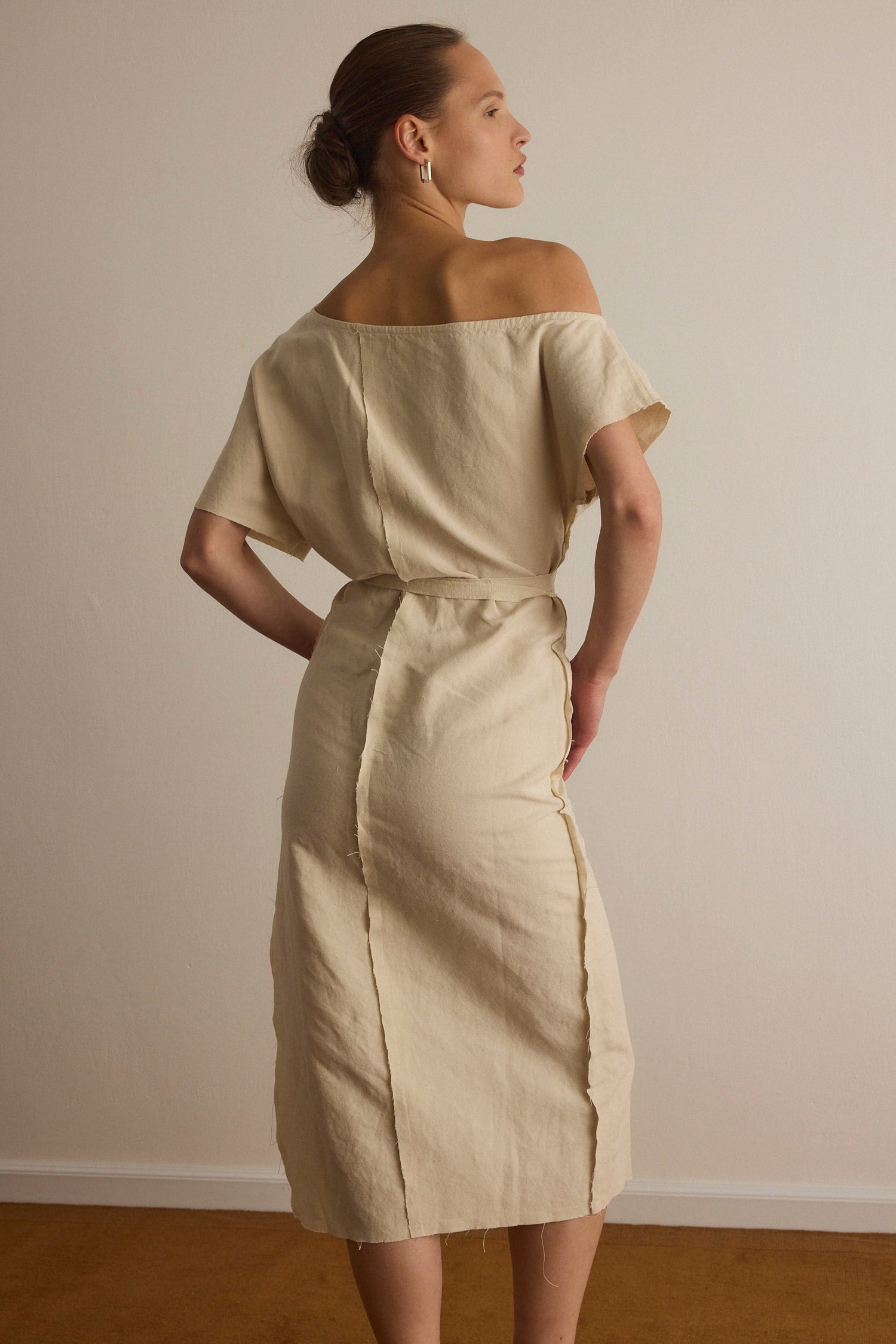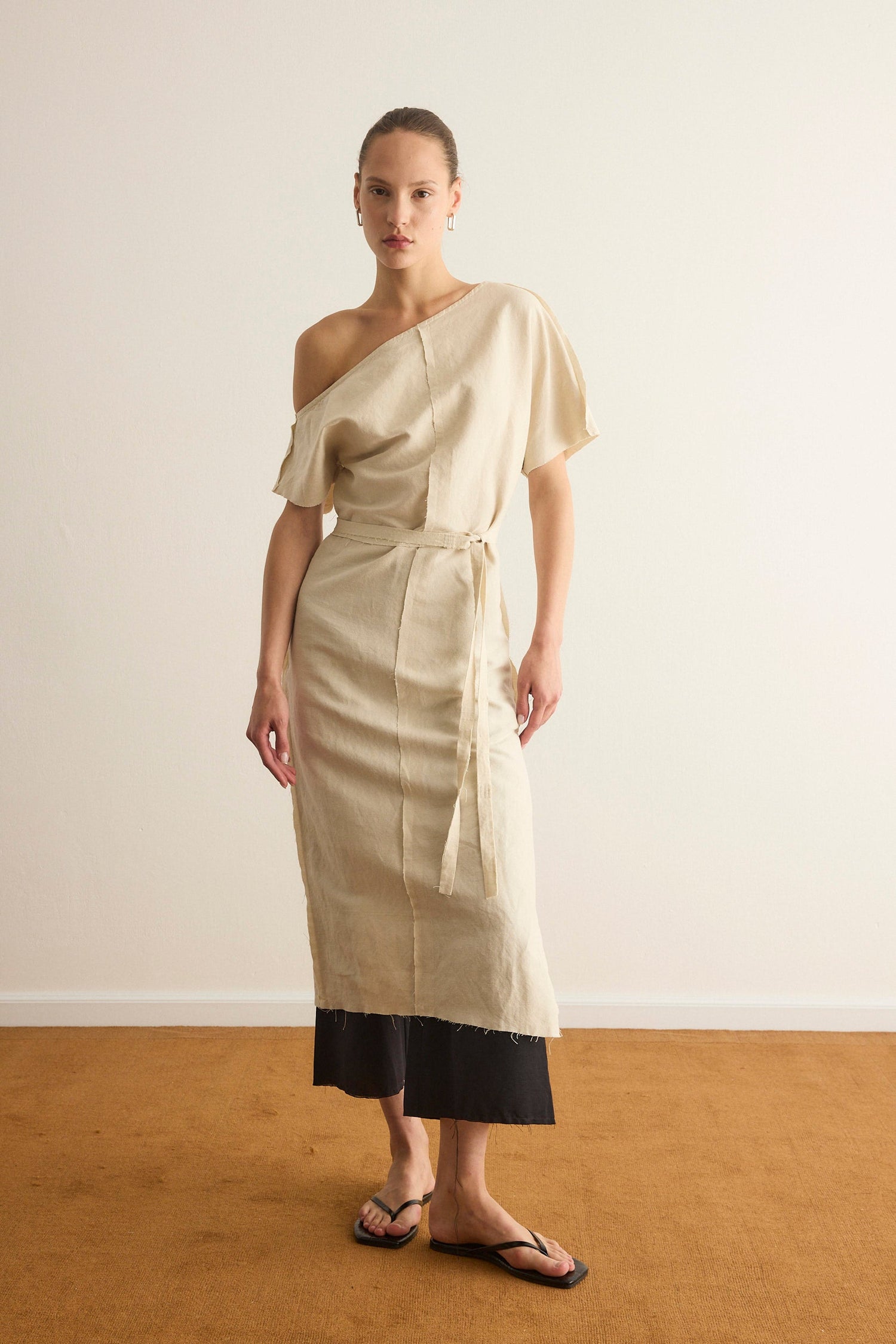 שמלת מידי אסימטרית בגזרה צמודה עם קשירה במותן ושסע בתפר צד ודיטיילס פרימות בסיומת, עשויה מבד פשתן נעים וקייצי.