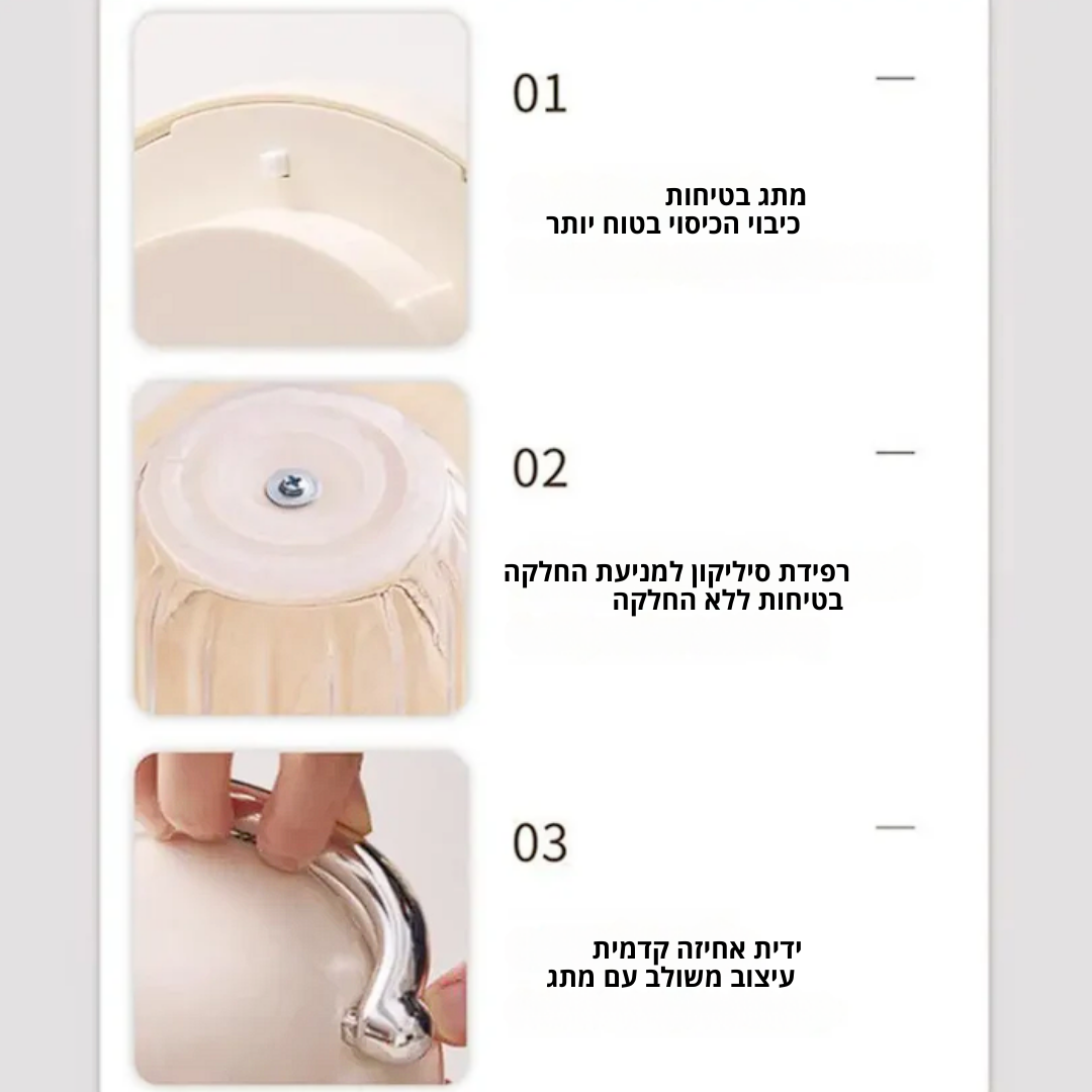חומרים: ABS, PP, זכוכית שקופה, סיליקון, מתכת