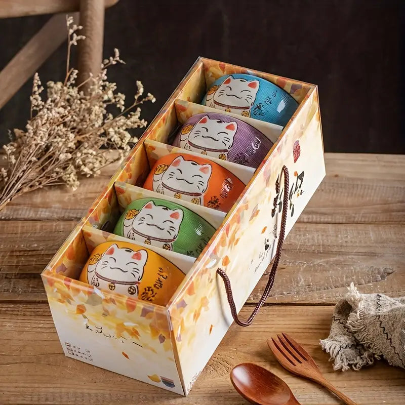 ™Lorvian | סט 5 קערות קרמיקה עם חתולים – צבעים חיים, מתאים למיקרוגל