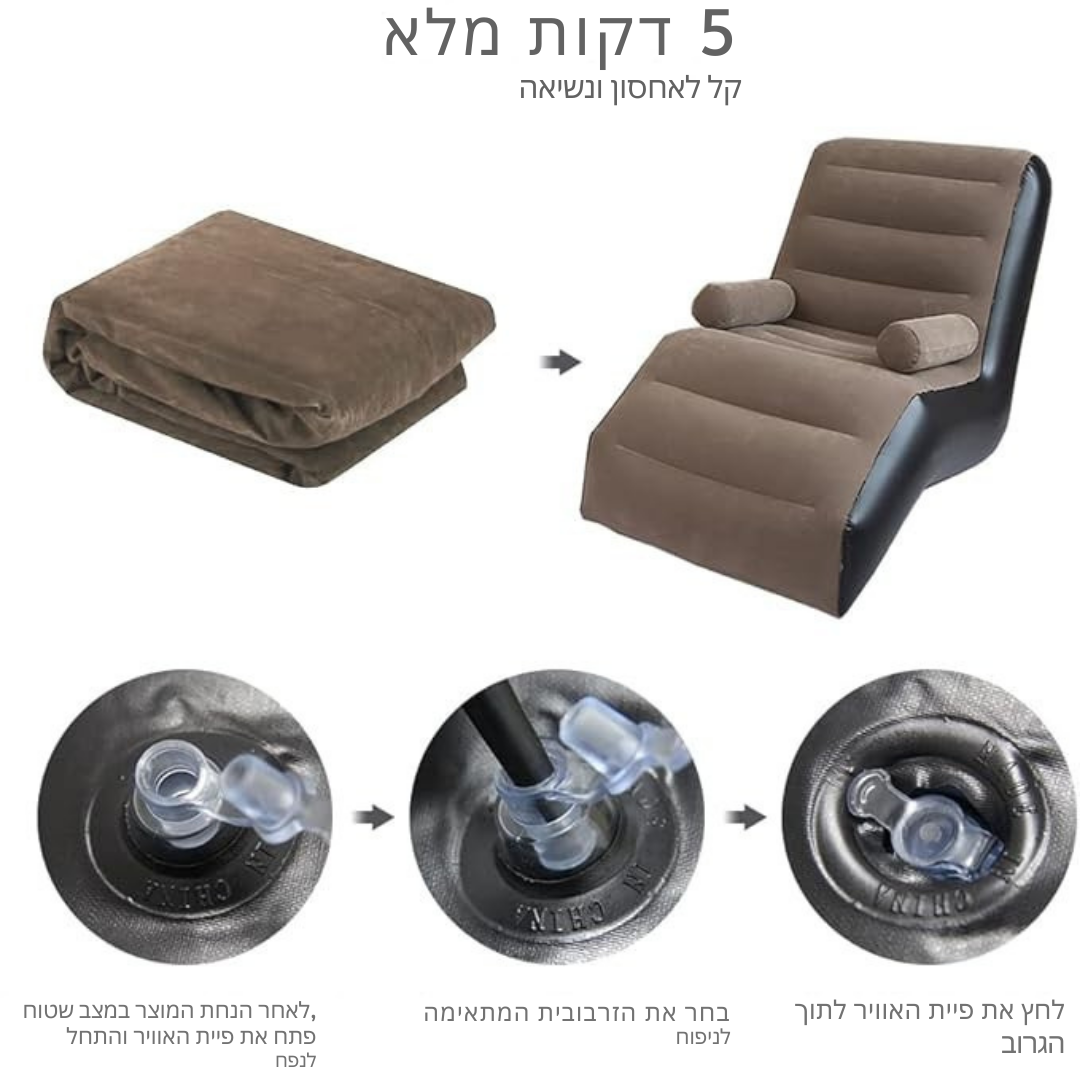 כיסא מתנפח עם משאבת אוויר לניפוח מהיר ולרגעי מנוחה נעימים.